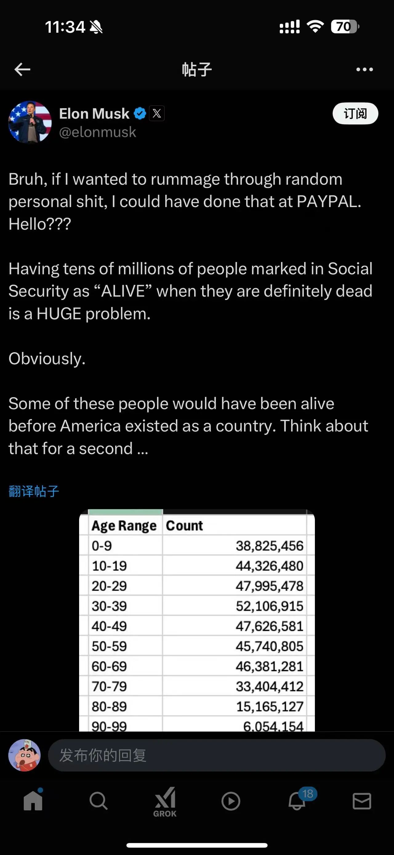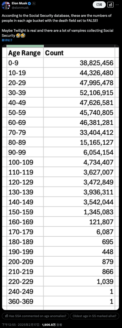 馬斯克周一公布了美國社保數(shù)據(jù)庫中,每個年齡段中“是否死亡”字段設(shè)置為否的人數(shù)。其中存在兩個問題:人數(shù)對不上和年齡太離譜。