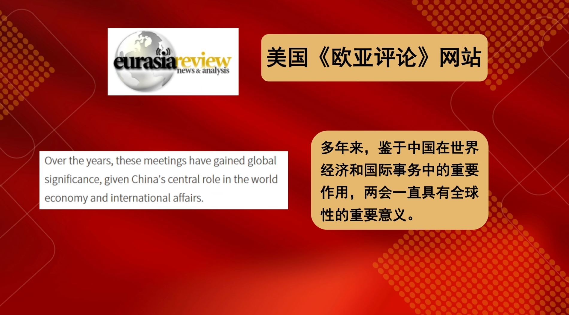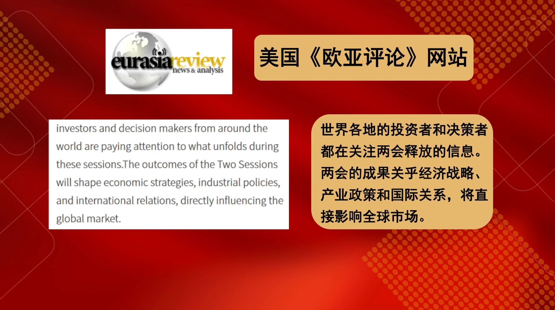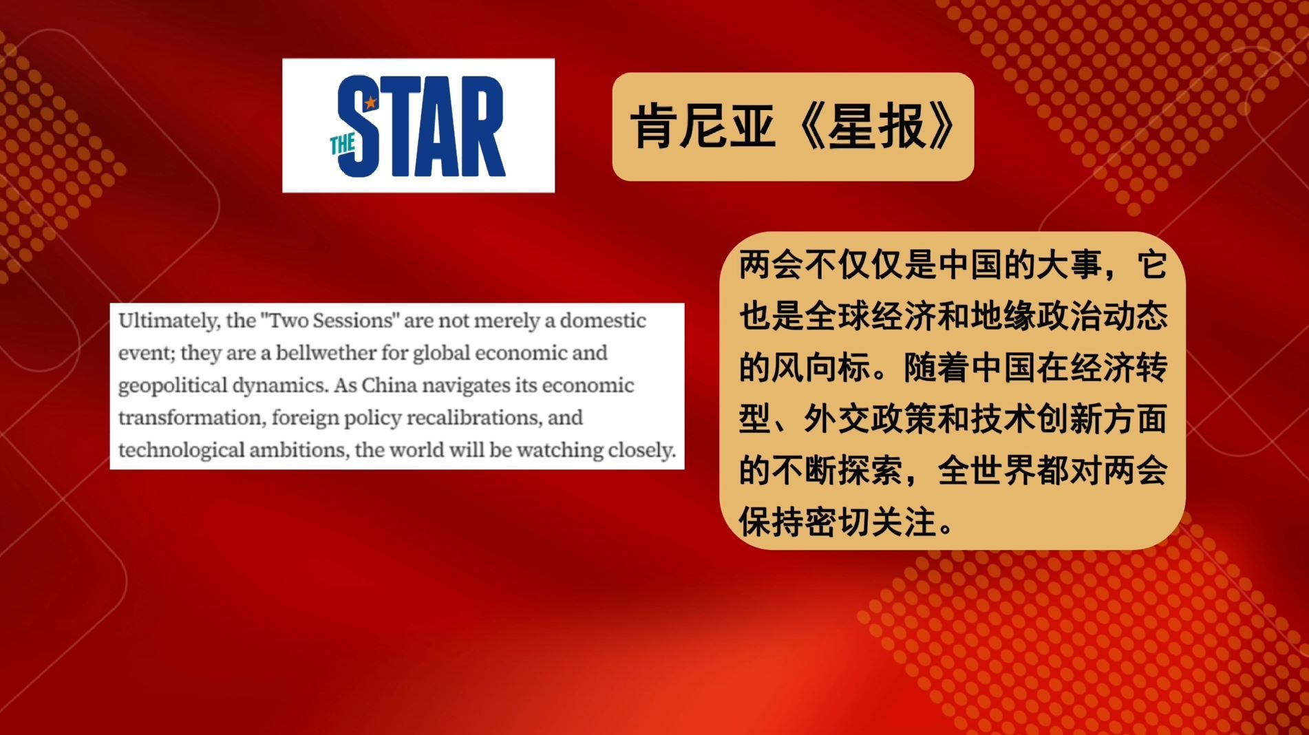 多家外國(guó)媒體紛紛用“全球性的重要意義”“直接影響全球市場(chǎng)”“全球的風(fēng)向標(biāo)”“全球感受到兩會(huì)的深遠(yuǎn)影響”這些描述,對(duì)中國(guó)兩會(huì)對(duì)世界的重要性給予高度肯定。