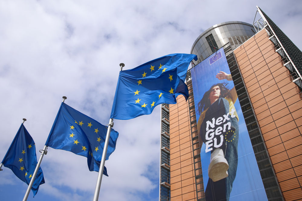 2021年5月21日,歐盟旗幟在比利時布魯塞爾的歐盟總部外飄揚。新華社記者鄭煥松攝