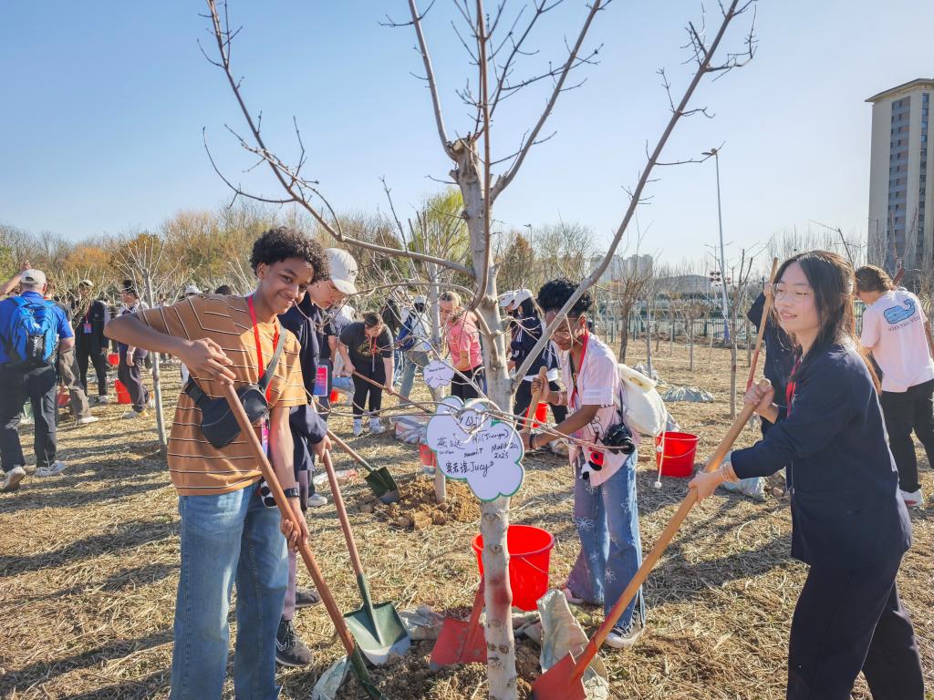 3月20日,春分,參訪的美國(guó)學(xué)生和中國(guó)同齡人,在河北省園博園的中美友誼傳承青年林,共植友誼樹。