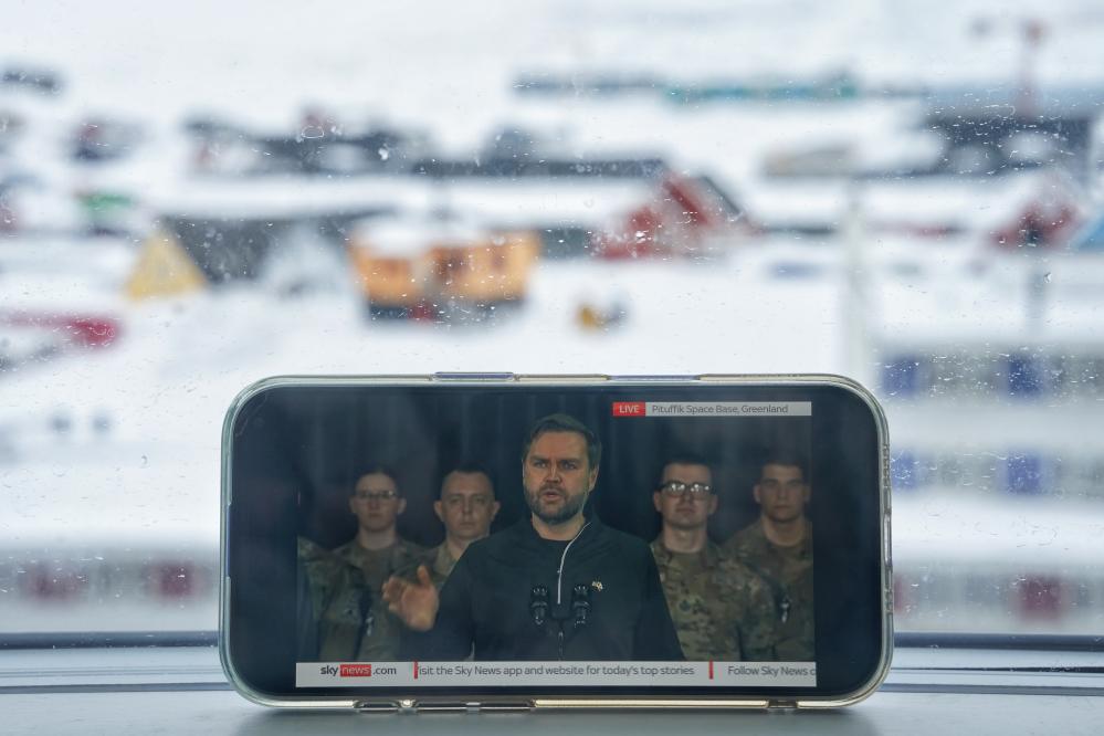 這是3月28日在丹麥自治領(lǐng)地格陵蘭島首府努克拍攝的美國(guó)副總統(tǒng)萬(wàn)斯講話的直播畫面。新華社記者彭子洋攝