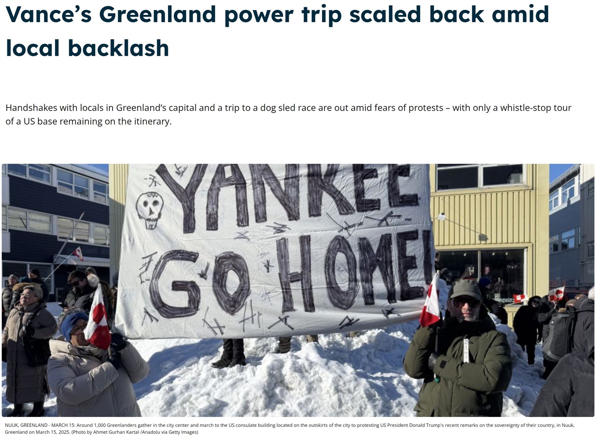 迫于輿論壓力,萬斯的夫人烏莎·萬斯此行不得不取消了去格陵蘭島首府努克和第二大城市錫西米尤特參加相關文化活動的計劃。
