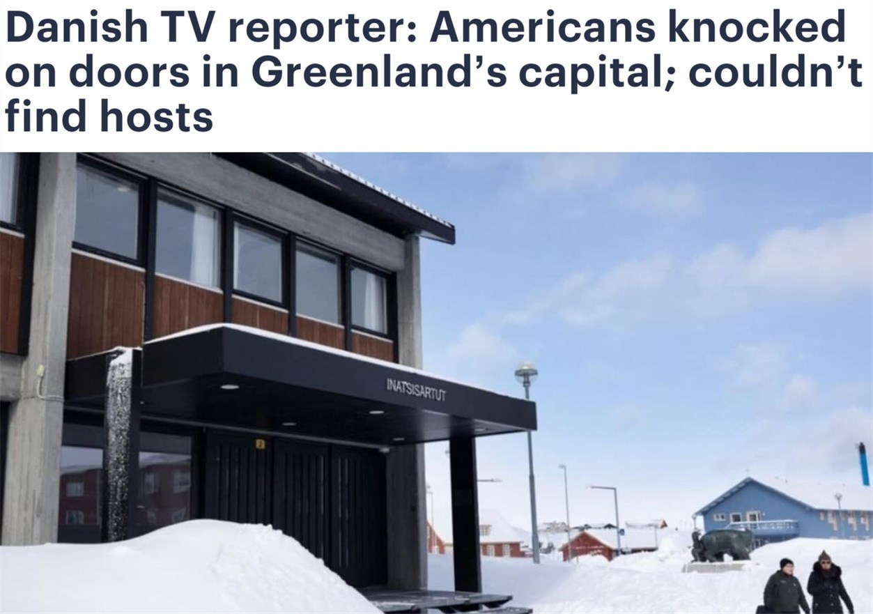 據丹麥電視二臺記者賈斯珀·斯坦梅茨在節(jié)目中披露,萬斯率領的代表團出發(fā)之前,美國政府已秘密派人到格陵蘭島相關地區(qū)“做工作”,希望當?shù)孛癖姎g迎萬斯一行,但卻碰了一鼻子灰。