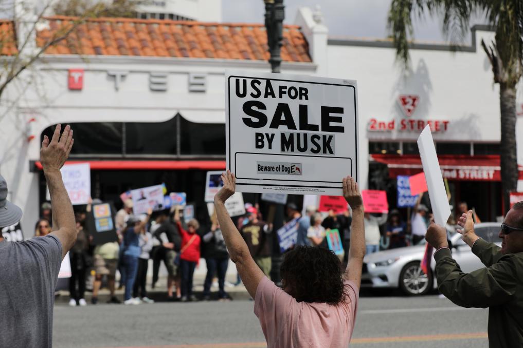 2025年3月29日,示威者聚集在美國加利福尼亞州帕薩迪納的一家特斯拉門店外。新華社發(fā)(邱晨攝)