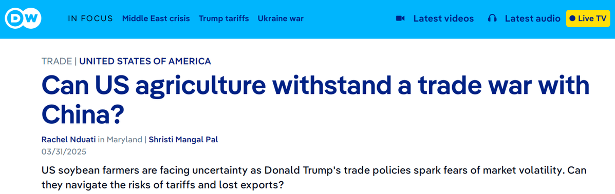 德國之聲3月31日報(bào)道稱,特朗普的貿(mào)易政策引發(fā)市場動(dòng)蕩擔(dān)憂,美國大豆種植戶面臨巨大的不確定性。美國大豆出口,特別是對華出口,多年來一直在下降。特朗普貿(mào)易政策對農(nóng)民的全面影響可能要等到下一個(gè)收獲季才會(huì)完全顯現(xiàn)。