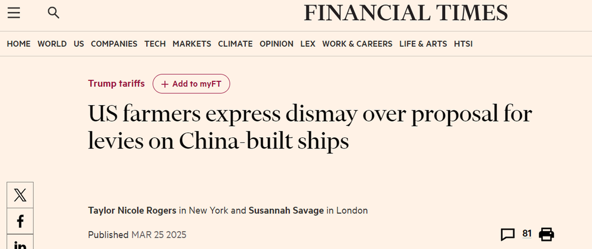 另據(jù)英國《金融時(shí)報(bào)》報(bào)道,美國中西部農(nóng)民非常擔(dān)憂,加征“港口費(fèi)”必將進(jìn)一步削弱農(nóng)產(chǎn)品出口競爭力。美國大豆出口委員會(huì)首席執(zhí)行官吉姆·薩特表示,整個(gè)行業(yè)對提案“措手不及”。