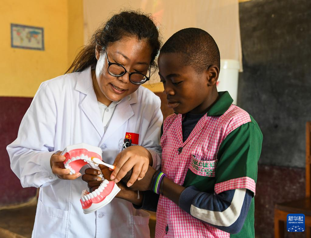 4月3日,在喀麥隆姆巴爾馬約的一所小學,中國(山西)第24批援喀麥隆醫(yī)療隊姆巴爾馬約分隊的醫(yī)生為學生演示正確的刷牙技巧。新華社發(fā)(科普索攝)