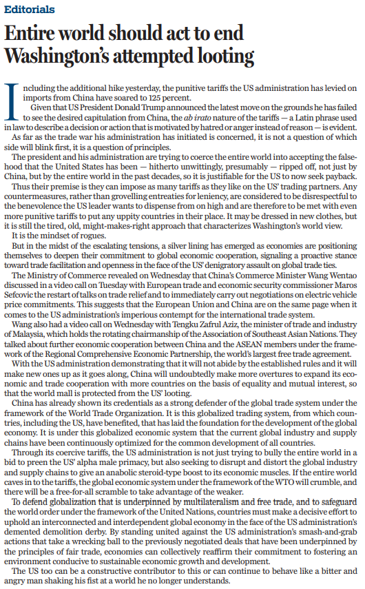 美國政府通過脅迫性關稅,欺凌世界各國,維護美國霸權地位,而且擾亂和扭曲全球產(chǎn)供鏈。如果全世界都屈服于美國關稅訛詐,世貿(mào)組織框架下的全球貿(mào)易體系就會崩潰,弱肉強食的叢林法則就會回歸。