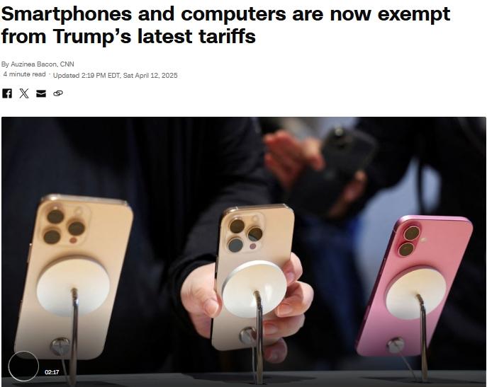 美國海關與邊境保護局發(fā)布的文件顯示,這些產品被排除在政府對貿易伙伴實施的所謂“對等關稅”之外。豁免的產品適用于4月5日以后進入美國的電子產品,已經支付的“對等關稅”可以尋求退款。