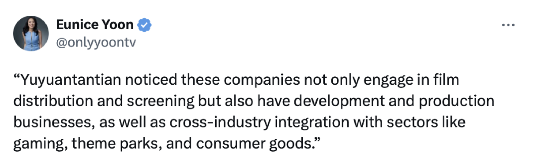 美媒的一位記者還專門在社交媒體上援引玉淵譚天的觀點(diǎn)說(shuō),由于美國(guó)文化產(chǎn)業(yè)的核心盈利點(diǎn)確實(shí)在于知識(shí)產(chǎn)權(quán)和品牌價(jià)值。因此,如果中國(guó)消費(fèi)者開(kāi)始在電影領(lǐng)域?qū)γ绹?guó)產(chǎn)品“降溫”,這種趨勢(shì)很可能會(huì)進(jìn)一步外溢,影響到其他依賴美國(guó)IP和品牌溢價(jià)的行業(yè)。