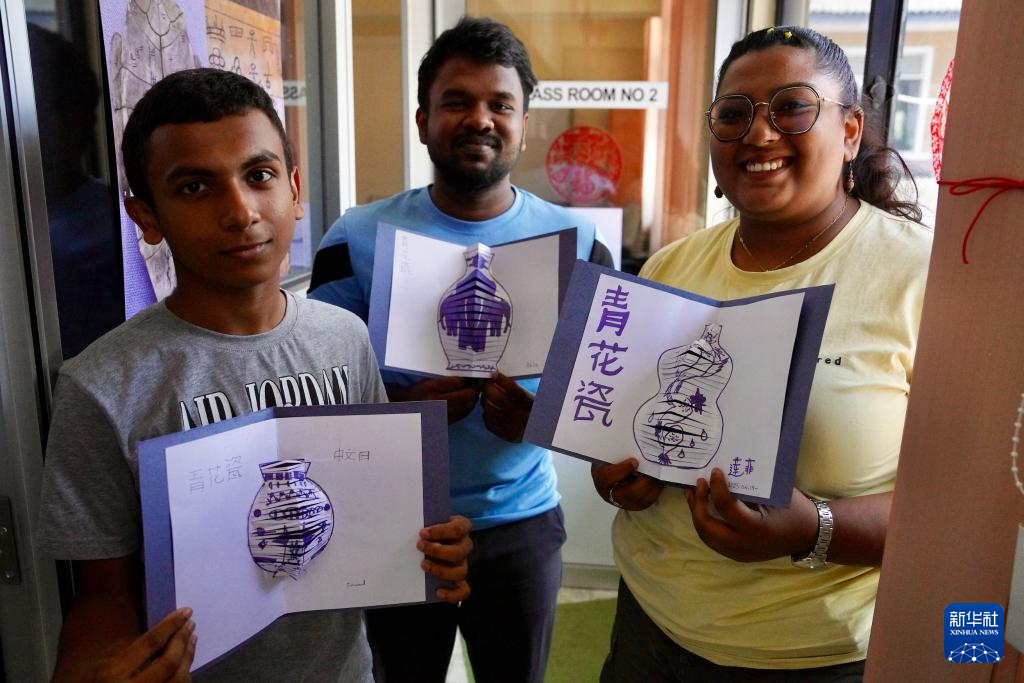 在學(xué)習(xí)制作青花瓷賀卡的課堂上,21歲的阿基拉·恰米卡拉一邊描畫(huà)青花瓷瓶身的弧線,一邊將斯里蘭卡大象與中國(guó)傳統(tǒng)紋樣填入其中,沿著畫(huà)紙細(xì)細(xì)裁剪幾道,便制成一張立體賀卡?!拔液芟矚g中國(guó)文化,我想在作品中將中國(guó)文化與斯里蘭卡本土文化相融合。”他說(shuō)。