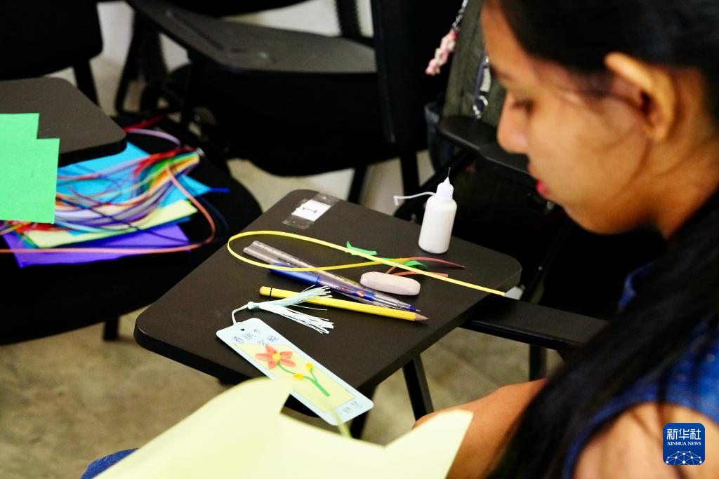 4月19日,在斯里蘭卡首都科倫坡舉行的聯(lián)合國(guó)中文日活動(dòng)上,蘭比尼孔子課堂的學(xué)生學(xué)習(xí)制作衍紙書(shū)簽。新華社記者 伍岳 攝