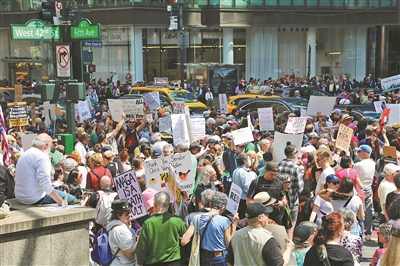 美方濫施關(guān)稅措施招致美國(guó)國(guó)內(nèi)越來越多的反對(duì)聲音,擔(dān)憂情緒在民眾中不斷蔓延。美國(guó)哥倫比亞廣播公司與輿觀調(diào)查公司的一項(xiàng)最新民調(diào)結(jié)果顯示,58%的受訪美國(guó)民眾表示反對(duì)美國(guó)關(guān)稅政策,53%的受訪者認(rèn)為美國(guó)國(guó)會(huì)應(yīng)該阻止或限制新關(guān)稅,58%的受訪者認(rèn)為關(guān)稅政策導(dǎo)致食品雜貨價(jià)格上漲。4月19日,美國(guó)多地舉行抗議活動(dòng),首都華盛頓、紐約、舊金山、波士頓等城市的民眾走上街頭,抗議現(xiàn)政府加征關(guān)稅、大規(guī)模裁員、驅(qū)逐移民等政策。