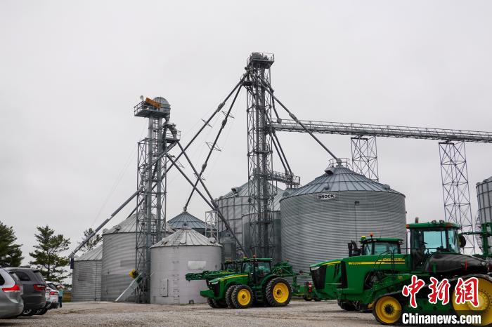 當?shù)貢r間4月25日,在美國艾奧瓦州首府得梅因市郊的金伯利農(nóng)場,多輛拖拉機停在谷倉附近。 中新社記者 王帆 攝