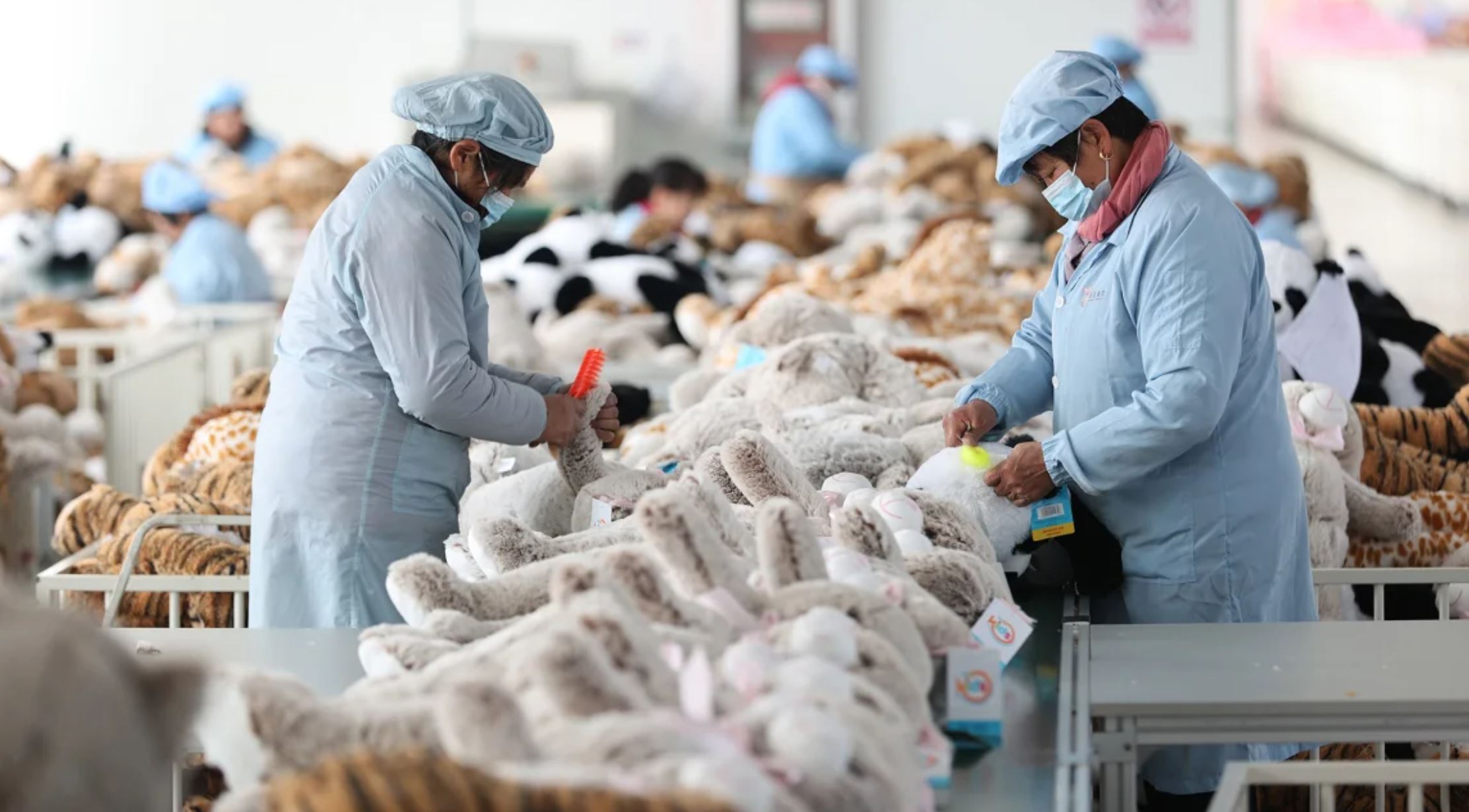 △中國連云港一家玩具制造廠的工人在準備出口到其他國家的毛絨玩具。(圖自美國有線電視新聞網(wǎng)相關(guān)報道)