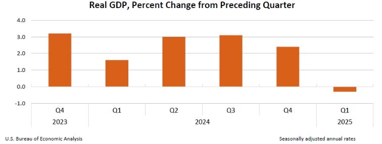 4月30日,美國商務(wù)部公布了2025年美國一季度經(jīng)濟數(shù)據(jù),美國一季度國內(nèi)生產(chǎn)總值環(huán)比(按年率計算)萎縮0.3%,為三年來首次負(fù)增長。