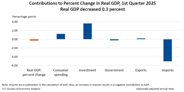 △美國商務(wù)部經(jīng)濟分析局發(fā)布2025年一季度美國GDP受各分項影響數(shù)據(jù)。