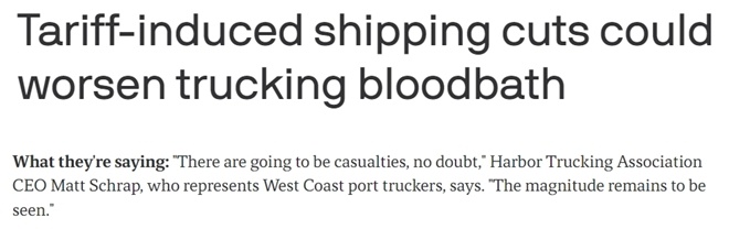 港口卡車運輸協(xié)會首席執(zhí)行官馬特·施拉普表示,關稅政策若繼續(xù)下去,將嚴重影響整個物流行業(yè),“卡車公司將失去業(yè)務,倉庫也沒有存儲業(yè)務,甚至連碼頭裝卸工也沒有那么多工作了”。