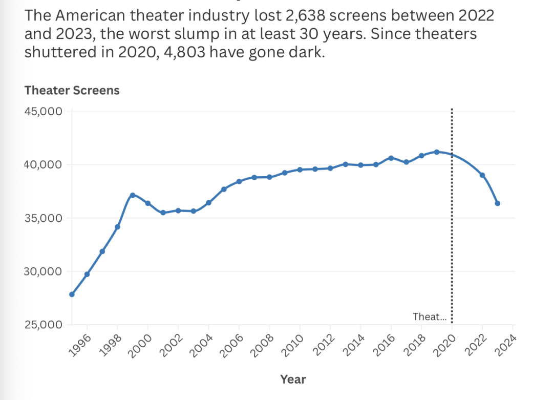 ?。?022年至2023年間,美國(guó)影院損失了2638塊銀幕,這個(gè)趨勢(shì)還在延續(xù)。