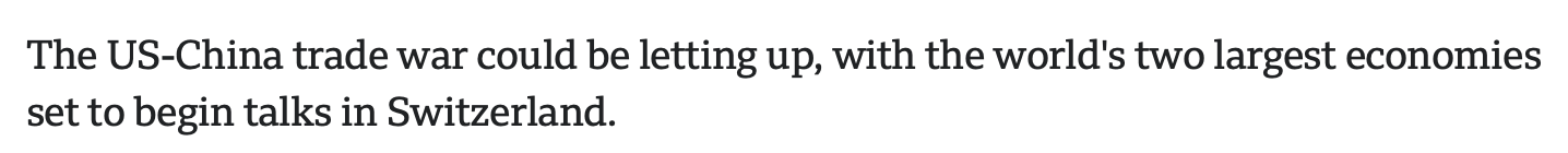 英國廣播公司的報道稱,隨著世界兩大經(jīng)濟體即將在瑞士開始會談,中美貿(mào)易戰(zhàn)可能正在緩和。