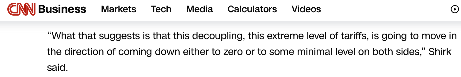 美國有線電視新聞網(wǎng)的報道注意到美國財政部長貝森特此前關于“本周末的談判將側(cè)重于緩和緊張局勢”的表態(tài)。報道援引加州大學圣迭戈分校全球政策與戰(zhàn)略學院研究教授、21世紀中國研究中心名譽主任蘇珊·希爾克的觀點指出,這表明美中之間“脫鉤、極端的關稅水平,將朝著降至零,或是降至最低水平的方向發(fā)展”。