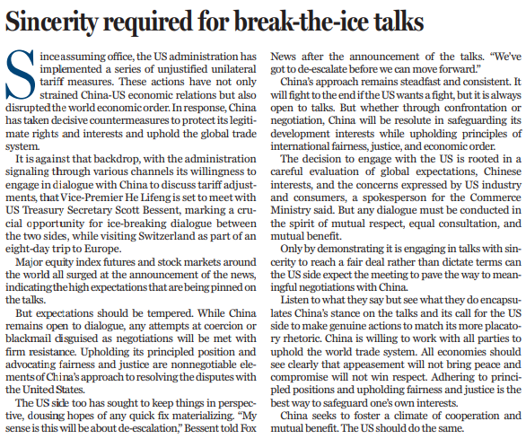近期,美方不斷表示,希望同中方就關(guān)稅調(diào)整進(jìn)行談判。當(dāng)?shù)貢r(shí)間10日上午,中美經(jīng)貿(mào)高層會(huì)談在瑞士日內(nèi)瓦開始舉行。中共中央政治局委員、國(guó)務(wù)院副總理何立峰作為中美經(jīng)貿(mào)中方牽頭人,當(dāng)天與美方牽頭人、美國(guó)財(cái)長(zhǎng)貝森特舉行會(huì)談。中美關(guān)稅戰(zhàn)迎來破冰契機(jī)。