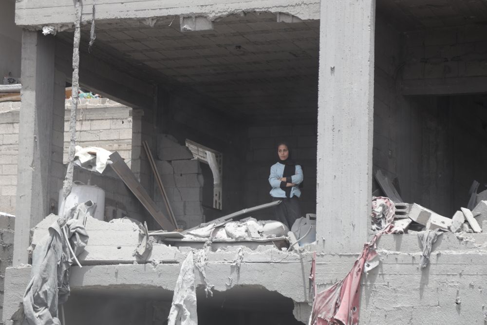 5月17日,在加沙地帶北部杰巴利耶難民營(yíng),一名女子站在破損的房屋中。新華社發(fā)(阿卜杜勒拉赫曼·薩拉馬 攝)