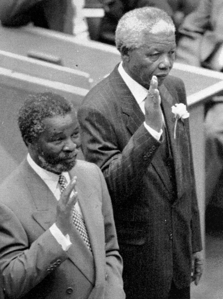 1994年5月9日,納爾遜·曼德拉(右)在南非首次多種族大選中當選為南非歷史上第一位黑人總統(tǒng)。新華社發(fā)