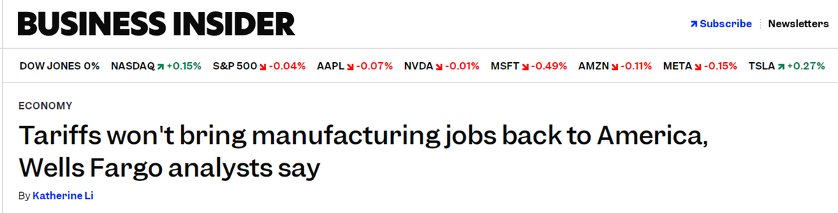 富國(guó)銀行最新報(bào)告明確指出,美國(guó)的高額關(guān)稅政策難以實(shí)現(xiàn)制造業(yè)就業(yè)的持久反彈。