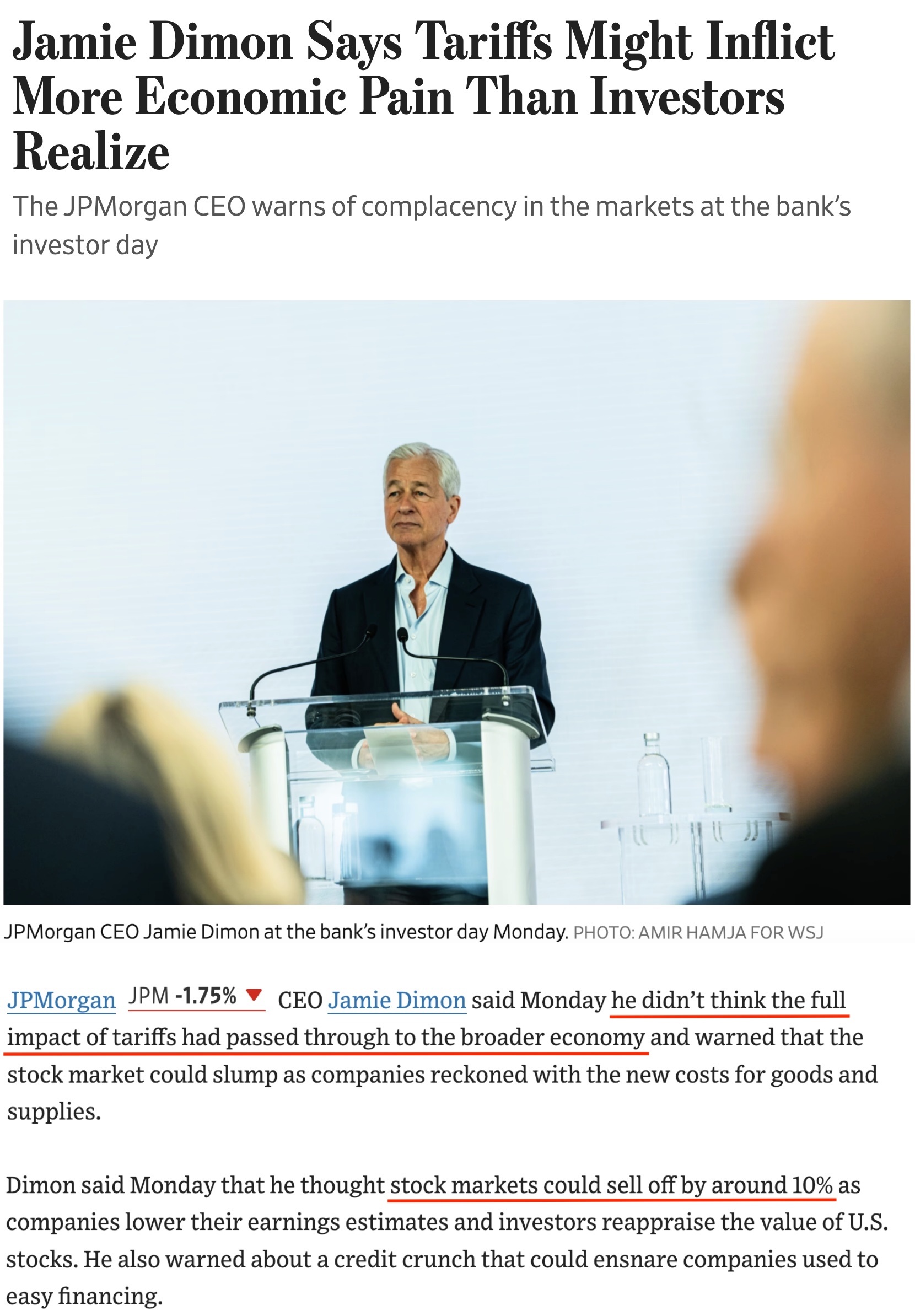 摩根大通公司首席執(zhí)行官杰米·戴蒙近日指出,關(guān)稅的全部影響尚未傳導(dǎo)至整體經(jīng)濟,通脹加劇和滯脹的可能性比人們認為的要大,隨著企業(yè)下調(diào)利潤預(yù)期以及投資者重新評估美國股票的價值,股市可能下跌約10%。
