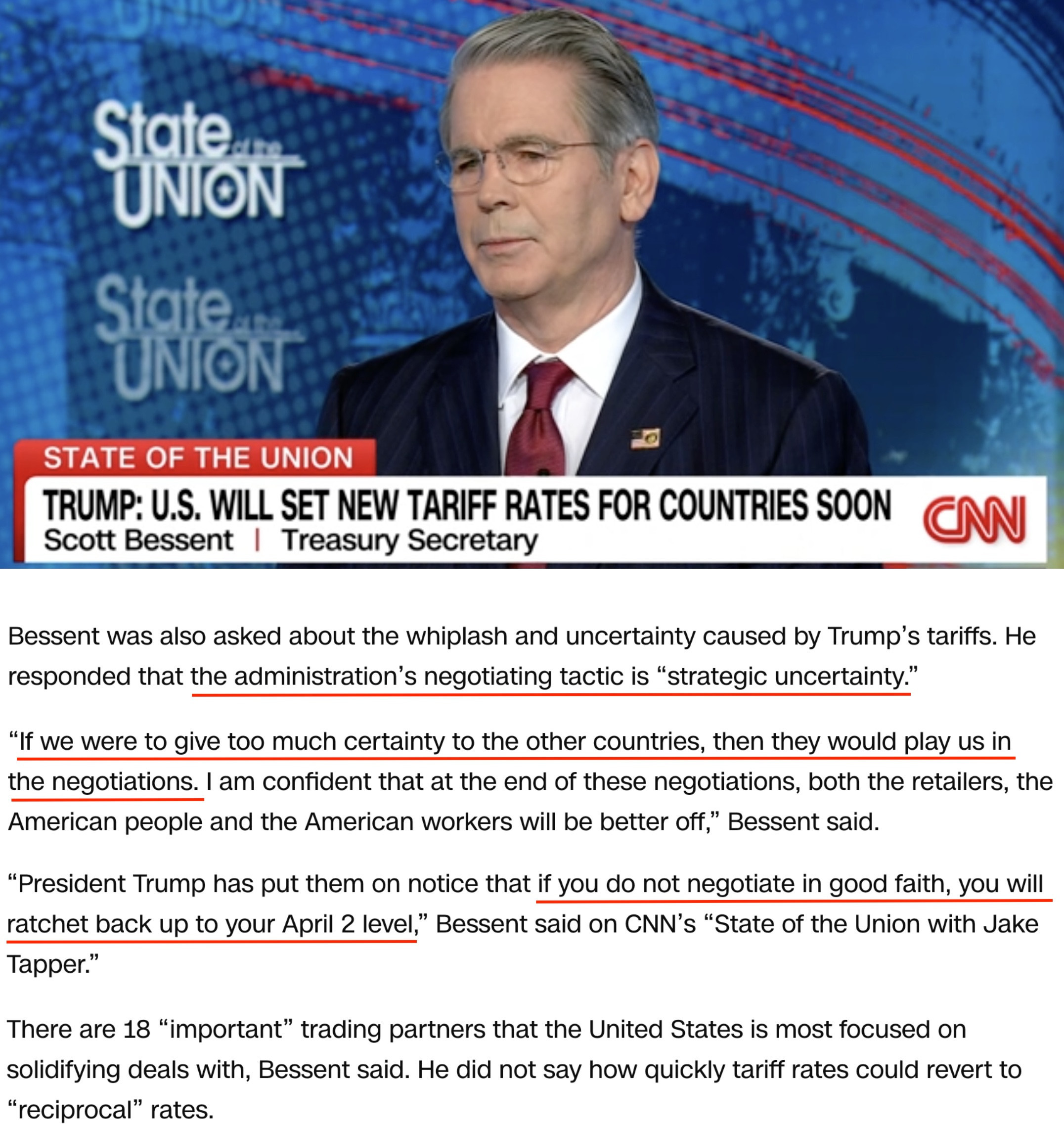 貝森特表示,美國政府正專注于與18個最重要的貿(mào)易伙伴,如果對方?jīng)]有“誠意”,他們的關(guān)稅稅率將回到4月2日的“對等”水平。
