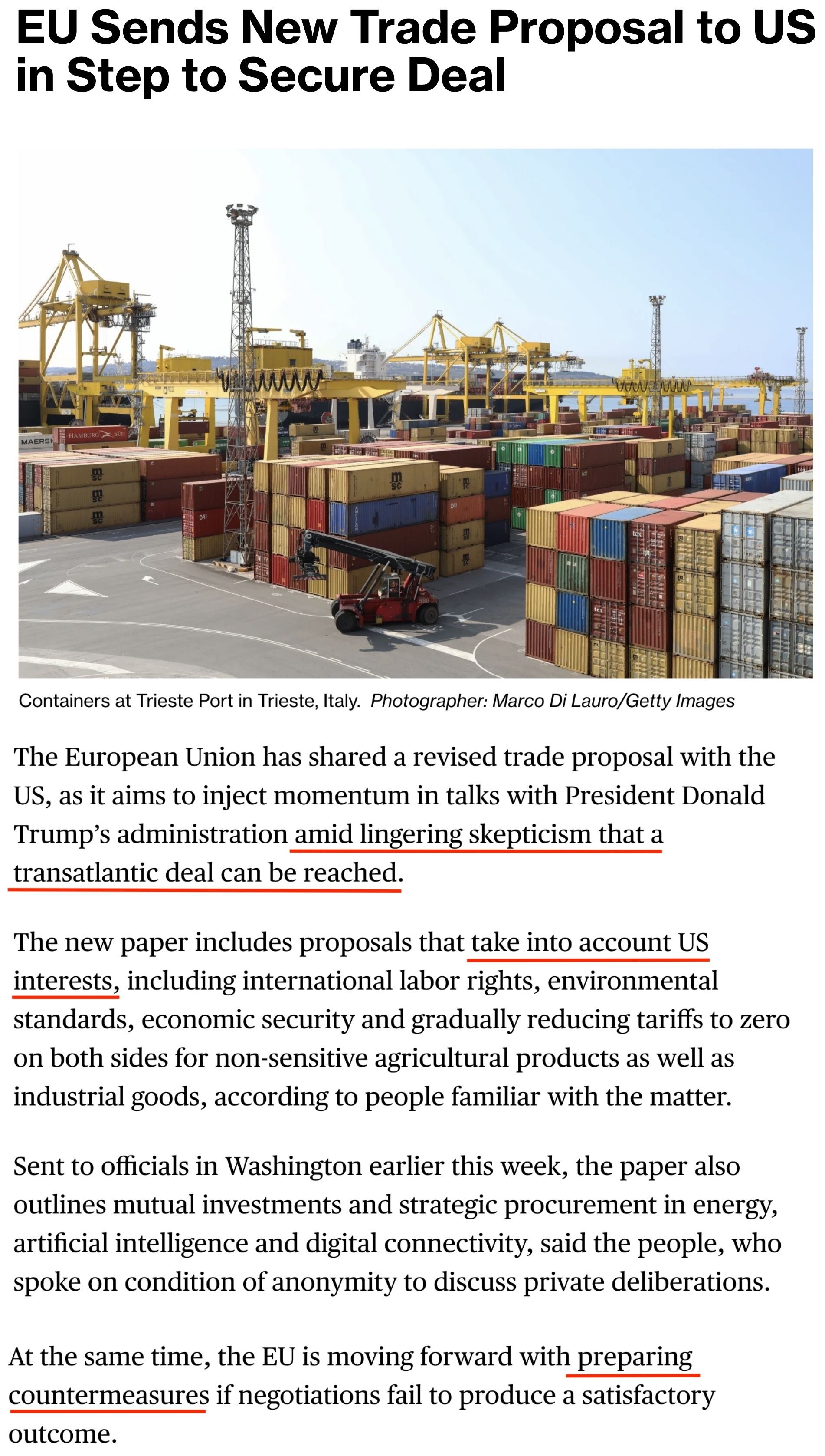 新提案包含了考慮美國利益的提議,包括國際勞工權(quán)利、環(huán)境標準、經(jīng)濟安全,并逐步將雙方非敏感農(nóng)產(chǎn)品以及工業(yè)品的關(guān)稅降至零。另外還涉及在能源、人工智能和數(shù)字互聯(lián)領(lǐng)域的相互投資和戰(zhàn)略采購等。