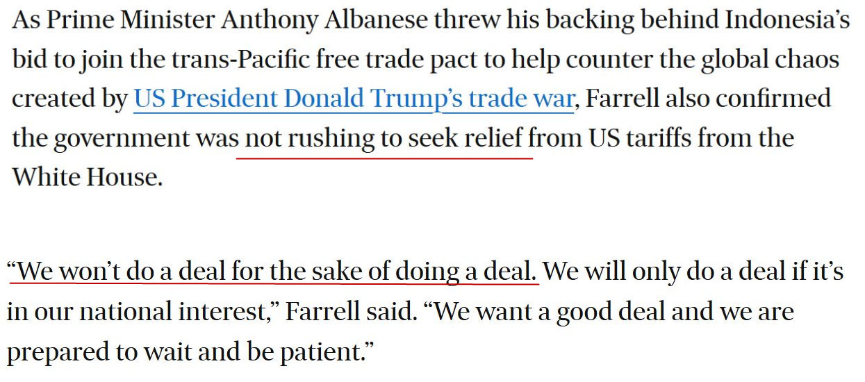 澳大利亞貿(mào)易部長法瑞爾近期也公開表示,澳大利亞政府不急于向美國方面尋求關(guān)稅減免。