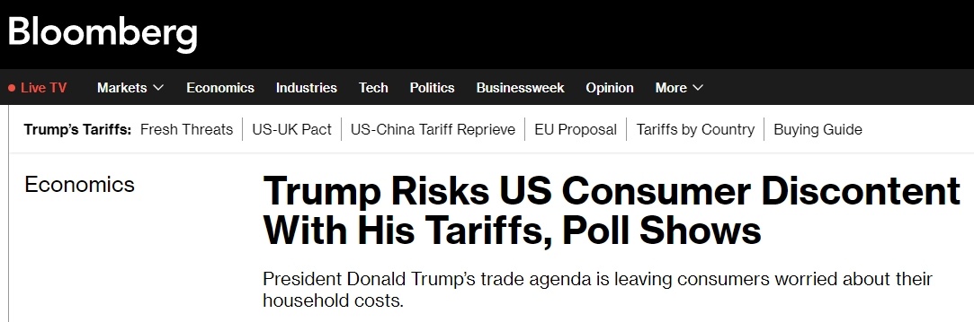 彭博社近日民調(diào)顯示,56%的受訪美國人認為,特朗普對其他國家征收的關(guān)稅對他們的家庭財務(wù)狀況產(chǎn)生了不良影響。即使特朗普政府一直在鼓吹加關(guān)稅能讓產(chǎn)業(yè)回流美國并增加財政收入,約52%的受訪者還是表示,美政府承諾的好處不值得他們?yōu)榇烁冻龅慕?jīng)濟代價。