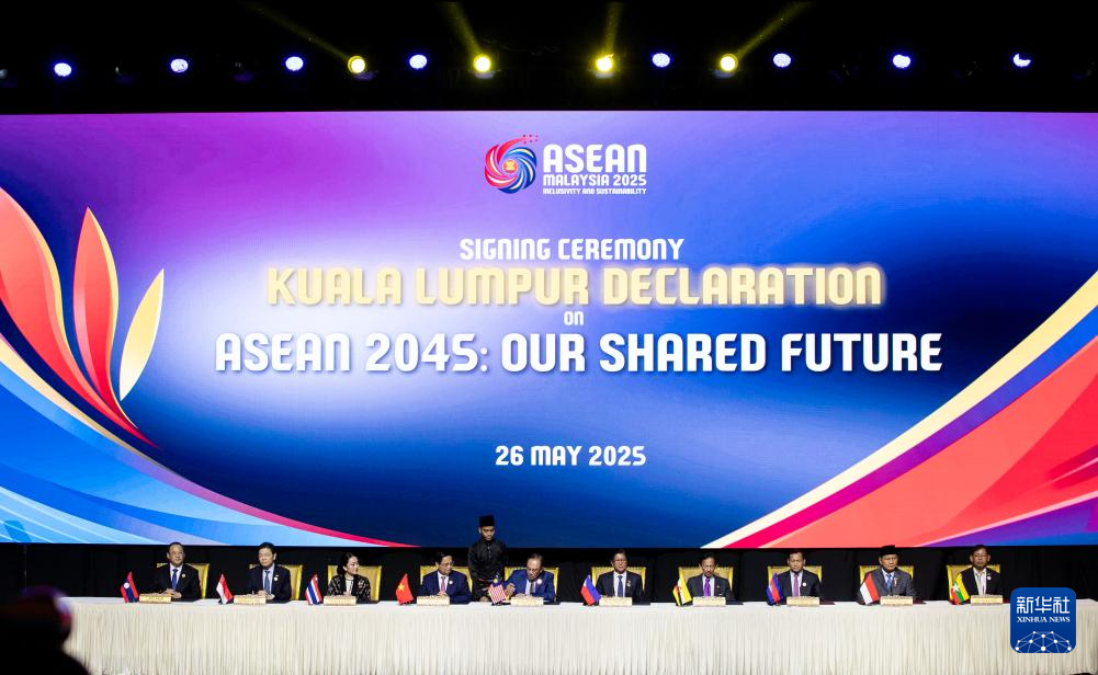 5月26日,在馬來西亞首都吉隆坡,老撾總理宋賽、新加坡總理黃循財、泰國總理佩通坦、越南總理范明政、馬來西亞總理安瓦爾、菲律賓總統(tǒng)馬科斯、文萊蘇丹哈桑納爾、柬埔寨首相洪瑪奈、印度尼西亞總統(tǒng)普拉博沃、緬甸外交部常秘昂覺莫、東帝汶總理夏納納(從左至右)在第46屆東盟峰會“吉隆坡宣言”簽署儀式上合影。新華社記者 馬平 攝