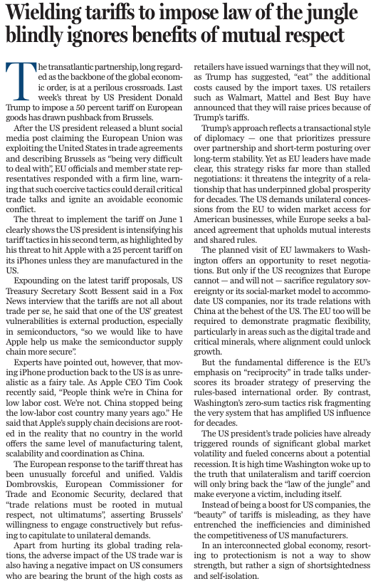 上周,美國(guó)總統(tǒng)特朗普威脅稱,自6月1日起將對(duì)歐盟商品征收50%的關(guān)稅。他在社交媒體平臺(tái)發(fā)文,直言不諱地指責(zé)歐盟長(zhǎng)期通過(guò)貿(mào)易協(xié)定榨取美國(guó),并稱與歐委會(huì)“極難打交道”。歐盟官員隨即強(qiáng)硬回應(yīng),警告稱,此類威脅可能導(dǎo)致至關(guān)重要的貿(mào)易談判破裂,引發(fā)一場(chǎng)本不必要的經(jīng)濟(jì)沖突。