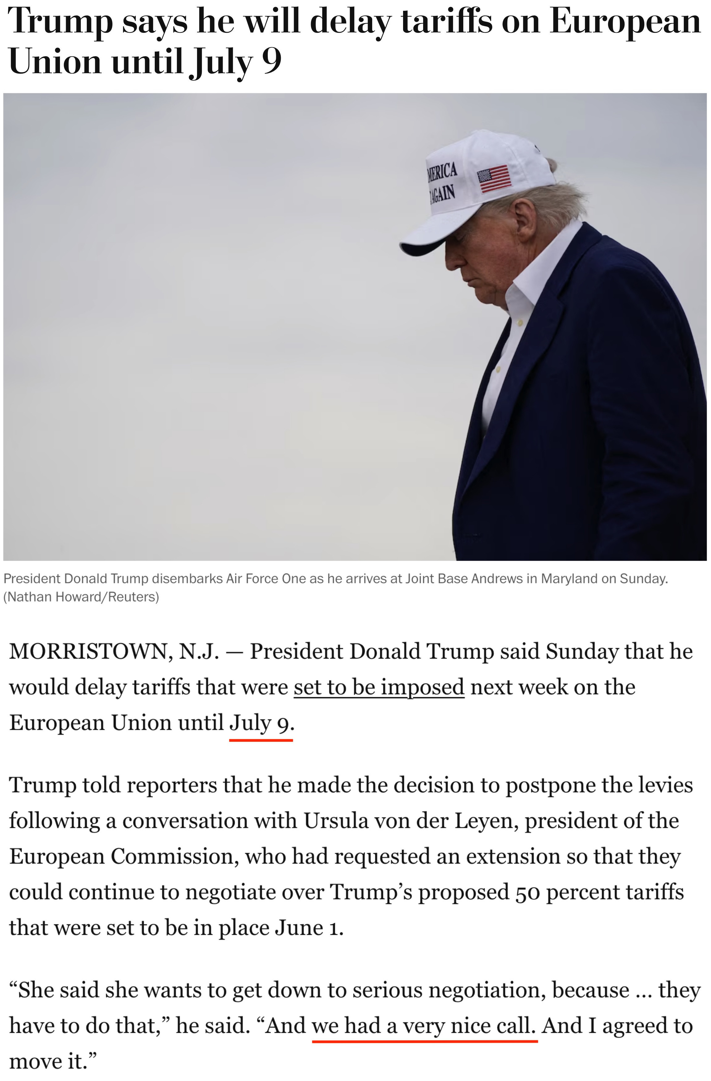 他25日告訴記者,自己當(dāng)天與歐盟委員會(huì)主席馮德萊恩“愉快”地通了電話(huà),并應(yīng)對(duì)方要求,決定將原計(jì)劃從6月1日開(kāi)始對(duì)歐盟加征的50%的關(guān)稅推遲到7月9日,以便雙方有時(shí)間就此進(jìn)行談判。