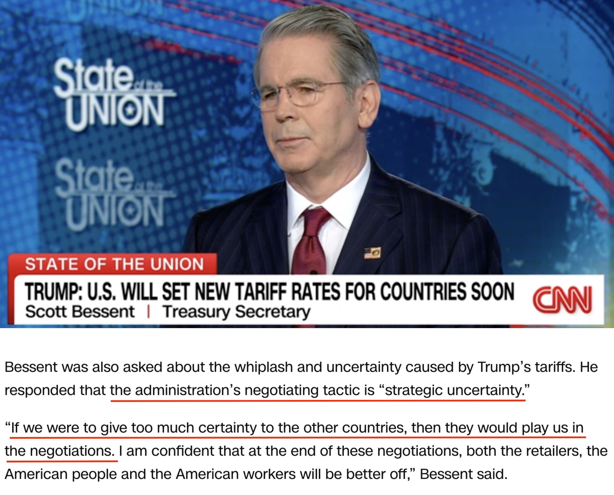 說(shuō)到美國(guó)關(guān)稅的不確定性,美國(guó)財(cái)長(zhǎng)貝森特近日接受采訪時(shí)曾有過(guò)一番“高論”。據(jù)他稱(chēng),在美國(guó)與貿(mào)易伙伴展開(kāi)關(guān)稅談判之際,美國(guó)政府表現(xiàn)出的“戰(zhàn)略不確定性”是一種談判策略,而非缺點(diǎn)。