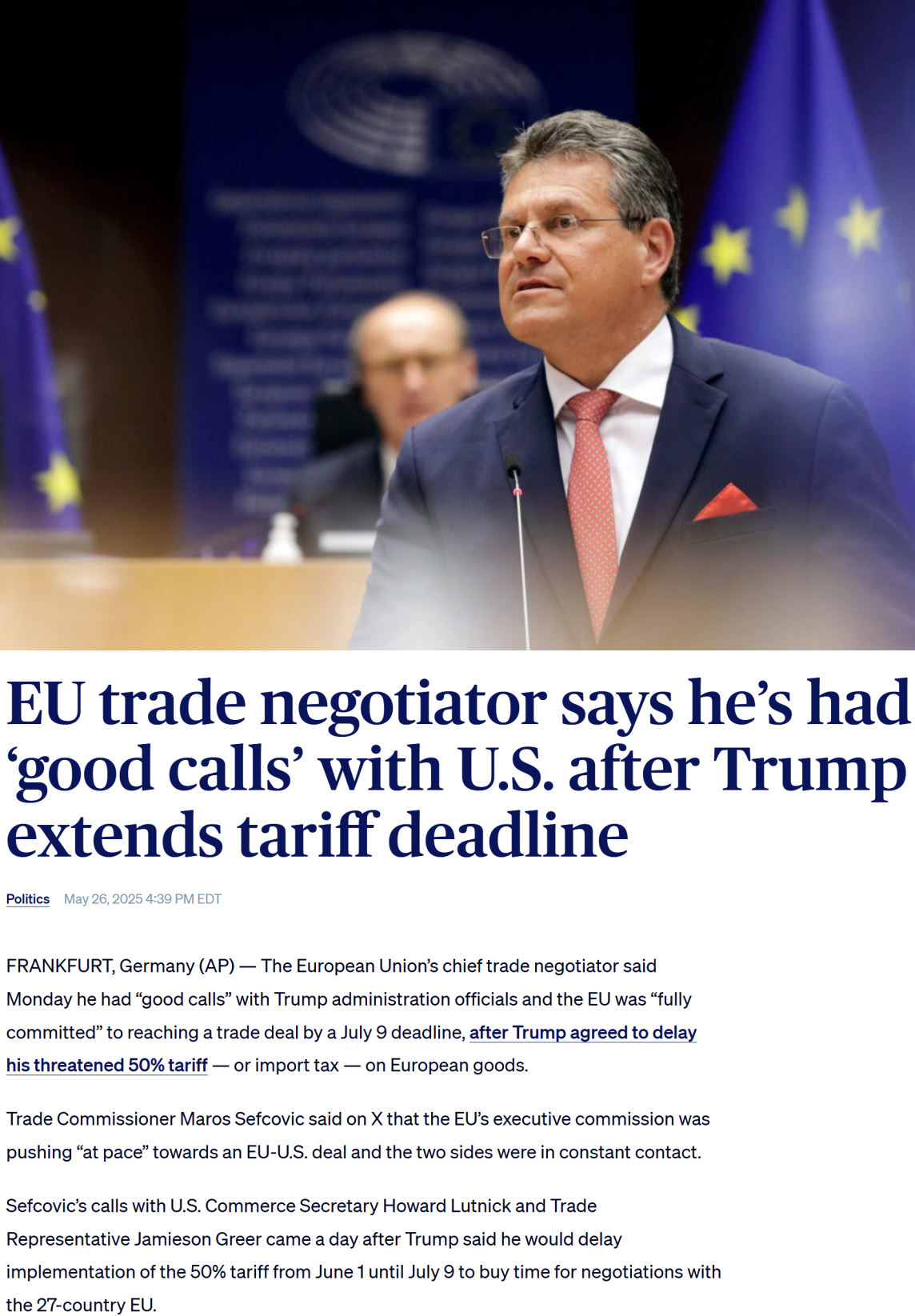 當(dāng)?shù)貢r(shí)間26日,歐盟貿(mào)易委員謝夫喬維奇與美方代表通話(huà)后表示,歐盟完全致力于在7月9日前與美方達(dá)成一項(xiàng)協(xié)議。