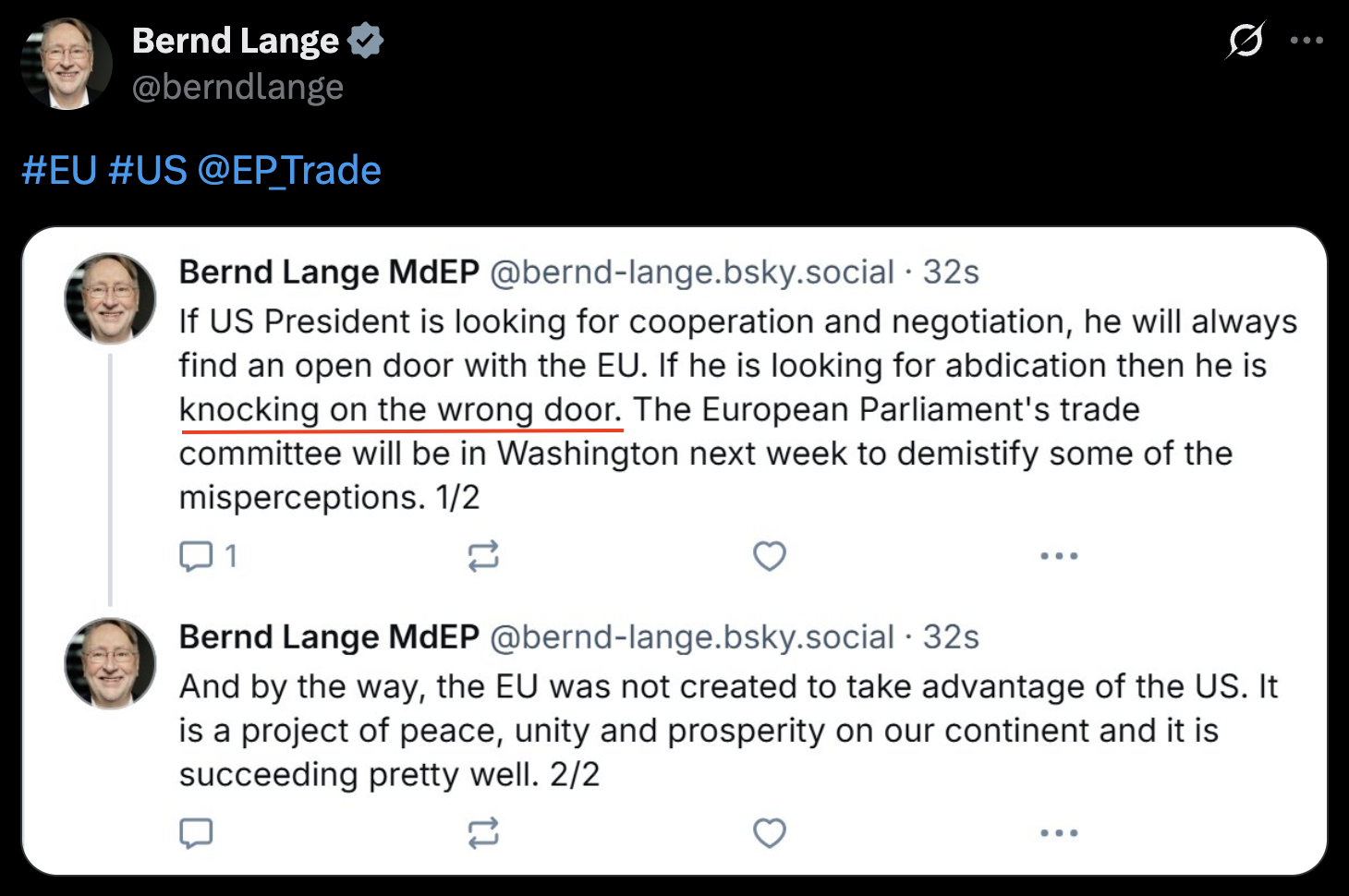 “如果美國(guó)尋求合作與談判,歐盟總是愿意敞開(kāi)大門(mén);但如果只是想讓我們照單全收美方的要求,那它就是敲錯(cuò)了門(mén)。”