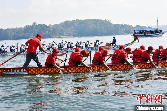 當?shù)貢r間5月31日,巴西瑞安商會和巴西青田同鄉(xiāng)總會在巴西圣保羅聯(lián)合舉辦“慶端午,龍舟競渡”活動,吸引近500名僑胞和巴西友人參加。圖為瑞安龍舟俱樂部的龍舟上水。中新社記者 林春茵 攝