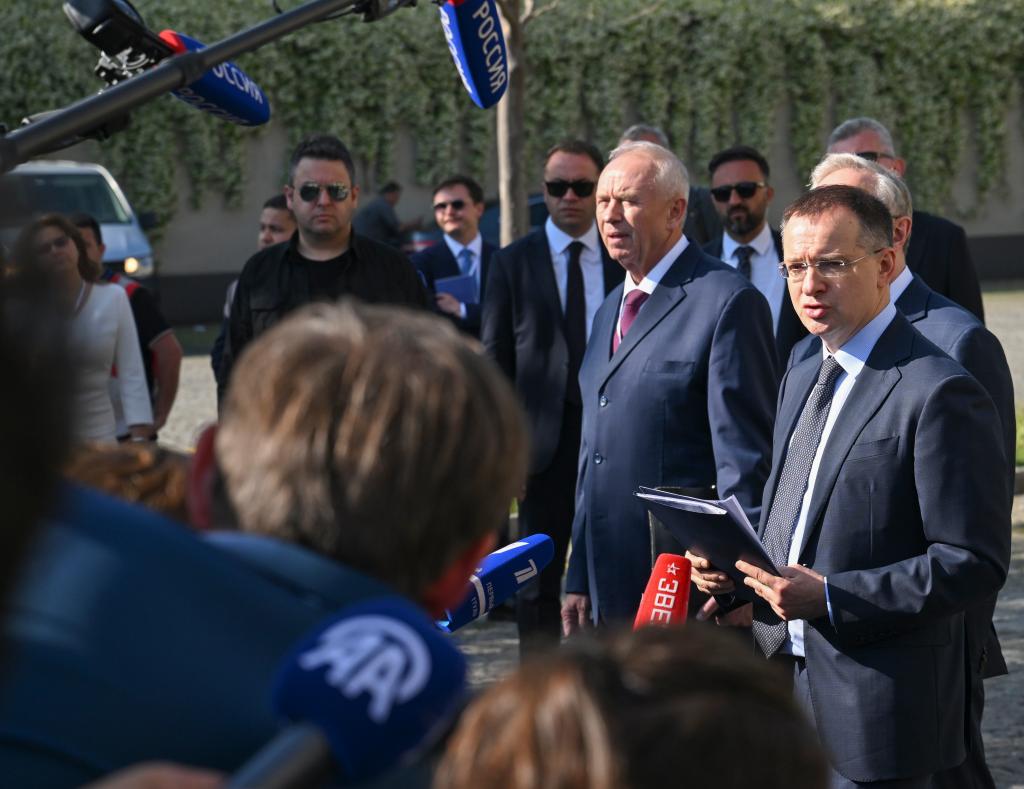 6月2日,在土耳其伊斯坦布爾舉行的俄烏第二輪直接談判結束后,俄羅斯總統(tǒng)助理、俄方談判代表團團長梅金斯基(右一)向媒體公布談判結果。新華社記者劉磊攝