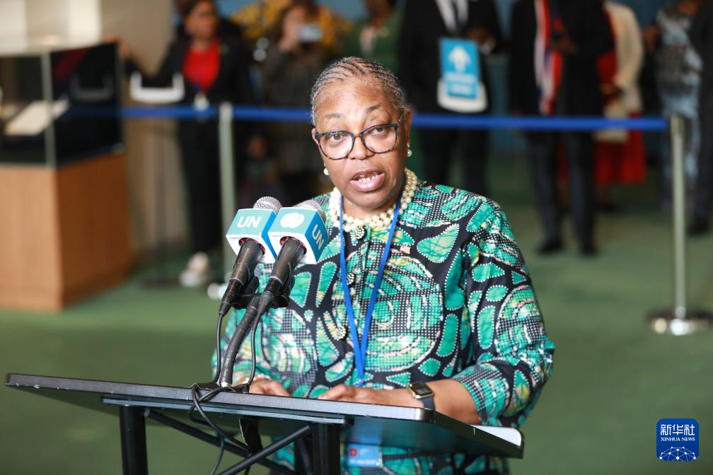 6月3日,在位于紐約的聯(lián)合國總部,利比里亞副外長格雷在利比里亞當選聯(lián)合國安理會非常任理事國后講話。新華社記者 謝鍔 攝
