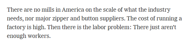 文章說(shuō),特朗普政府的高額關(guān)稅給企業(yè)帶來(lái)了巨大壓力,迫使企業(yè)的負(fù)責(zé)人一直在思考自己能在美國(guó)多生產(chǎn)多少產(chǎn)品。但是,美國(guó)既沒(méi)有滿足該行業(yè)需求的規(guī)模工廠,也沒(méi)有主要的拉鏈和紐扣供應(yīng)商。運(yùn)營(yíng)工廠的成本很高。此外還有勞動(dòng)力問(wèn)題:工人根本不夠用。
