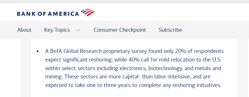 美國(guó)美銀證券(BofA Securities)6月發(fā)布的最新報(bào)告指出,盡管美國(guó)政府以“保護(hù)本土企業(yè)、保障就業(yè)”為由祭出關(guān)稅大棒,鼓勵(lì)企業(yè)將生產(chǎn)線遷回本土,但企業(yè)在重新布局全球供應(yīng)鏈時(shí),主要考量的因素已不再是成本,回流美國(guó)制造的意愿有限。