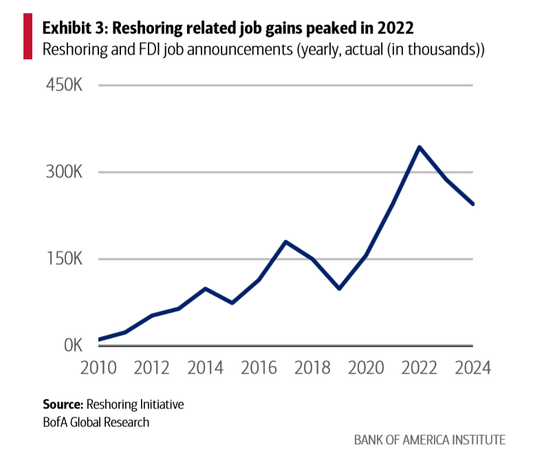 報(bào)告顯示,美國(guó)制造業(yè)回流創(chuàng)造的就業(yè)機(jī)會(huì)在2022年達(dá)到高峰后開始減少。