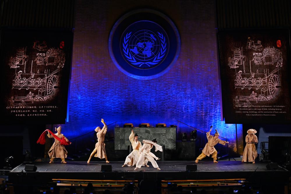6月9日,在位于紐約的聯(lián)合國(guó)總部,演員在“跨越山海的文明對(duì)話”專場(chǎng)文藝演出上表演舞劇《天工開(kāi)物》選段。新華社記者 李睿 攝