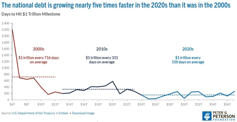 據(jù)其統(tǒng)計(jì),在本世紀(jì)第一個(gè)十年,美債每增加1萬億美元平均需要近兩年(716天);在本世紀(jì)第二個(gè)十年,這一時(shí)間縮短到了不到一年(331天);而到了目前所處的本世紀(jì)第三個(gè)十年,美債平均不到半年(150天)就會(huì)跨越一個(gè)萬億美元級(jí)大關(guān)。