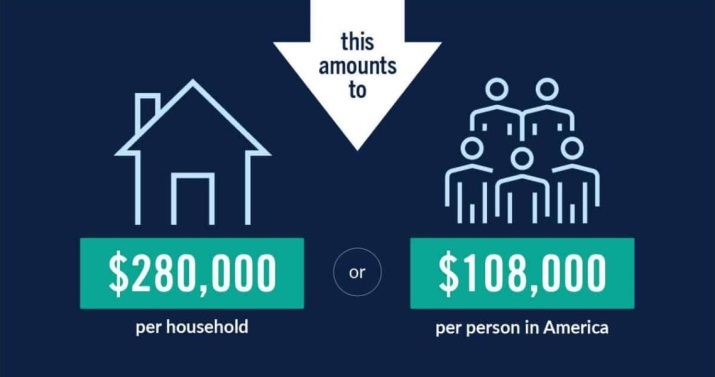 彼得森基金會(huì)給出驚人結(jié)果:如果將債務(wù)分?jǐn)偨o美國民眾,相當(dāng)于每戶家庭負(fù)債28萬美元,每個(gè)人負(fù)債10.8萬美元。