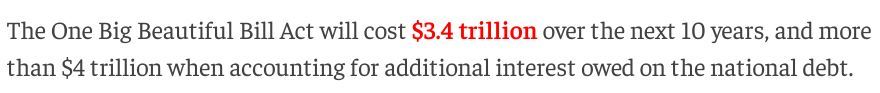 根據(jù)美國國會(huì)預(yù)算辦公室(CBO)上月做出的評(píng)估,“大而美”法案預(yù)計(jì)將在未來十年使美聯(lián)邦政府財(cái)政赤字增加約3.4萬億美元;如果算上同期的額外美債利息,新增赤字更是將超過4萬億美元。